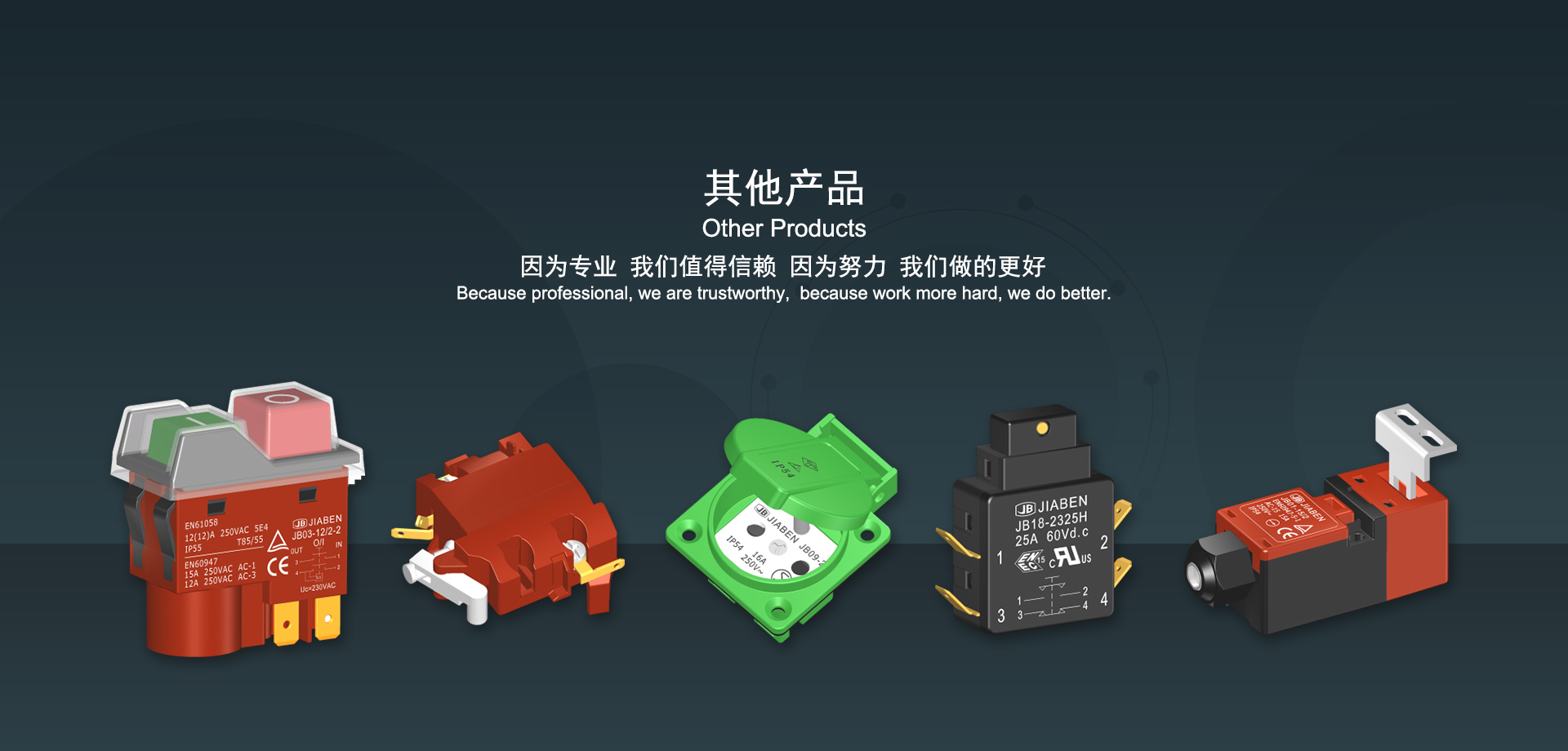 浙江佳奔電子有限公司始建于1986年,坐落于浙江省樂清市虹橋鎮(zhèn)東電子信息產(chǎn)業(yè)園內(nèi),現(xiàn)有職工700多人,資產(chǎn)總額超3億元。公司主要經(jīng)營(yíng)“JIABEN”牌微動(dòng)開關(guān)、蹺板開關(guān)、按鈕開關(guān)、扳機(jī)開關(guān)、調(diào)速開關(guān)和電位器開關(guān)等各類交、直流器具開關(guān)和各類交、直流線路板模塊等產(chǎn)品,主要應(yīng)用于交、直流電動(dòng)工具、電動(dòng)園林工具、清潔器具、家用電器和小型機(jī)床等行業(yè),是集產(chǎn)品設(shè)計(jì)、研發(fā)、制造、銷售和服務(wù)于一體的國(guó)家高新技術(shù)企業(yè)。JIABEN was founded in 1986, located in East Electronic Information Industry Park, Hongqiao Town, Yueqing City, Zhejiang Proviance, existing staff more than 700 peoples, more than 300 million RMB worth of assets. Company is mainly engaged in "JIABEN" brand Micro Switch, Rocker Switch, Push-button Switch, Trigger Switch, Speed Regulating Switch, Potentiometer Switch and other kinds of appliance switch and all kinds of AC or DC circuit board module, such as more than 100 series, 8000 kinds of models of products, mainly used in AC or DC Power-tools, Power Gardening Tools, Cleaning Appliances, Household Appliances and Small Machine Tool and other industries, is the collection product design, research and development, manufacturing, sales and service in one of the national high and new technology enterprise.